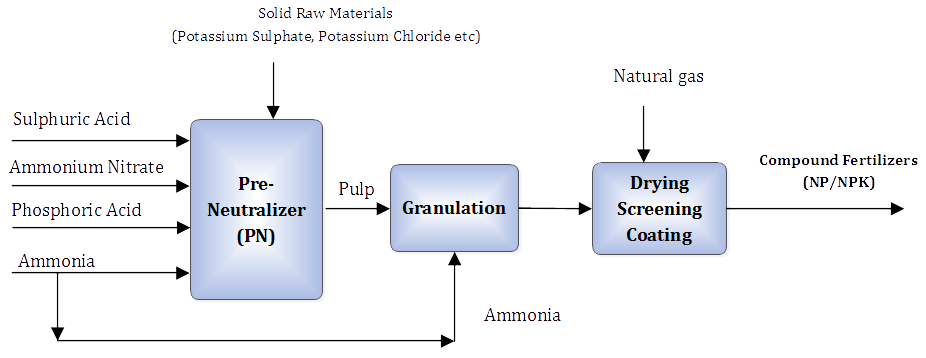 All the units are using the so called “slurry process” for the production of NPK’s. Gaseous ammonia reacts with phosphoric and sulphuric acid in a special vessel (preneutralizer). The operating conditions are regulated in such a way that the phosphoric acid is partially neutralized by ammonia. The produced slurry is introduced in a rotating drum (granulator) where it is mixed with solid recycle. Further ammoniation is taking place in the granulator by liquid ammonia. The produced granules are dried in a dryer and sieved. The coarse material is crushed, mixed with fines and returns to the granulator. The commercial product is cooled, treated with anticaking agent and sent to storage. Depending on the formula produced, additional raw materials can be added like:
