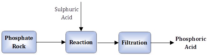 • Ground phosphate rock attack by sulphuric acid. The main reaction products are phosphoric acid (H3PO4) and gypsum (CaSO4.2H2O)